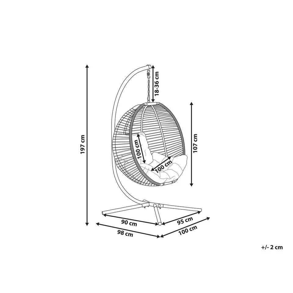 Hangstoel met een zitkussen. Deze hangende eierstoel biedt dankzij de zachte schommelbeweging een comfortabele plek voor iedereen die wat vrije tijd nodig heeft. De stevige standaard is gemaakt van robuust metaal dat de stabiliteit van het stuk en de lange levensduur garandeert. De zitting is geweven met polyesterdraad en zorgt in combinatie met het meegeleverde donzige zitkussen voor een gevoel van gezelligheid. Bovendien heeft dit meubel, dankzij de toepassing van een thermische spuitafwerking, een weerstand waardoor het niet alleen binnen maar ook buiten kan worden gebruikt.