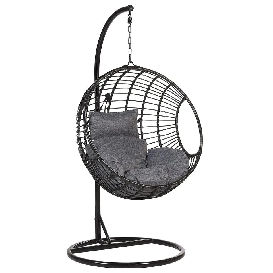 Ronde rotan hangstoel in stevig zwart metalen frame inclusief kussen. Deze hangende rieten stoel is een stijlvol stuk dat dankzij de zachte en dikke kussens ultiem comfort zal bieden na een lange dag. Stevig metalen frame zorgt voor stabiliteit en uithoudingsvermogen van het stuk. De mand is gemaakt van PE rattan waardoor hij slijtvast is en in de trendy boho stijl gehouden wordt. Plaats de schommelstoel in de woonkamer, bij het raam of voor de tv of op het balkon om van de frisse lucht te genieten.