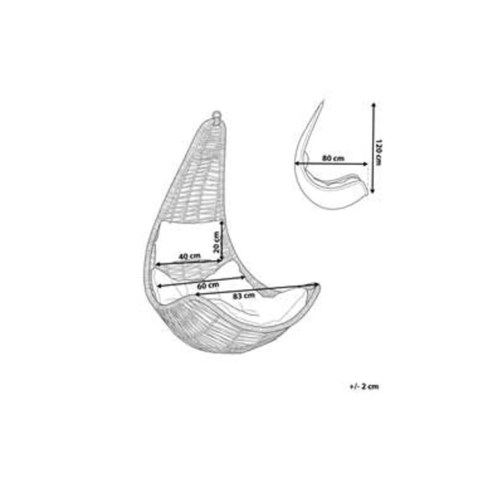 Extra informatie: Om de stoel op te hangen zal er een extra ketting of koord moeten worden gebruikt. Deze zit niet bij dit aanbod inbegrepen. Houd er rekening mee dat dit product gevoelig is voor weersomstandigheden en dus binnen moet worden opgeborgen wanneer het niet in gebruik is