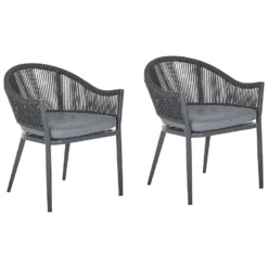 Twee trendy tuinstoelen met gevlochten touw en bijpassende gestoffeerde kussens. Geniet van de tijd met deze stijlvolle set voor je terras, balkon of tuin. De stoelen hebben een zeer licht maar robuust aluminium frame en een prachtige touwgaas rugleuning. De aluminium stoel is voorzien van extra zitkussens om het zitcomfort te verhogen. De onderhoudsvriendelijke stoffen hoezen zijn afneembaar en wasbaar.