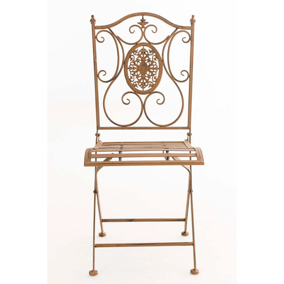 Klapbare ijzeren tuinstoel Sibell, een exclusieve eyecatcher voor elk terras en tuin. De delicate vorm en liefdevol handgemaakte details maken deze stoel uniek en zorgen voor een nostalgische uitstraling.