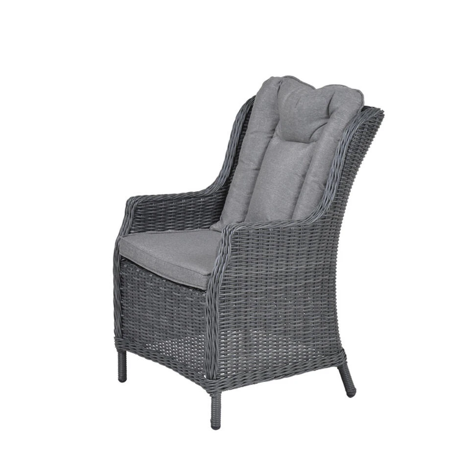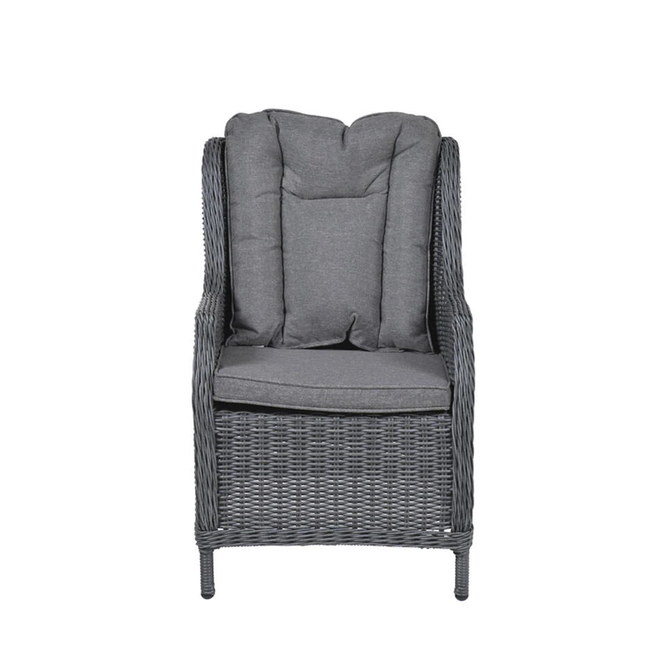 De afmeting van de stoel is: B 62 x D 73 x H 96.5 cm. De set is gemaakt van wicker in de kleur earl grey met een aluminium binnen frame en dikke polyester reflex grey kleurige kussens.