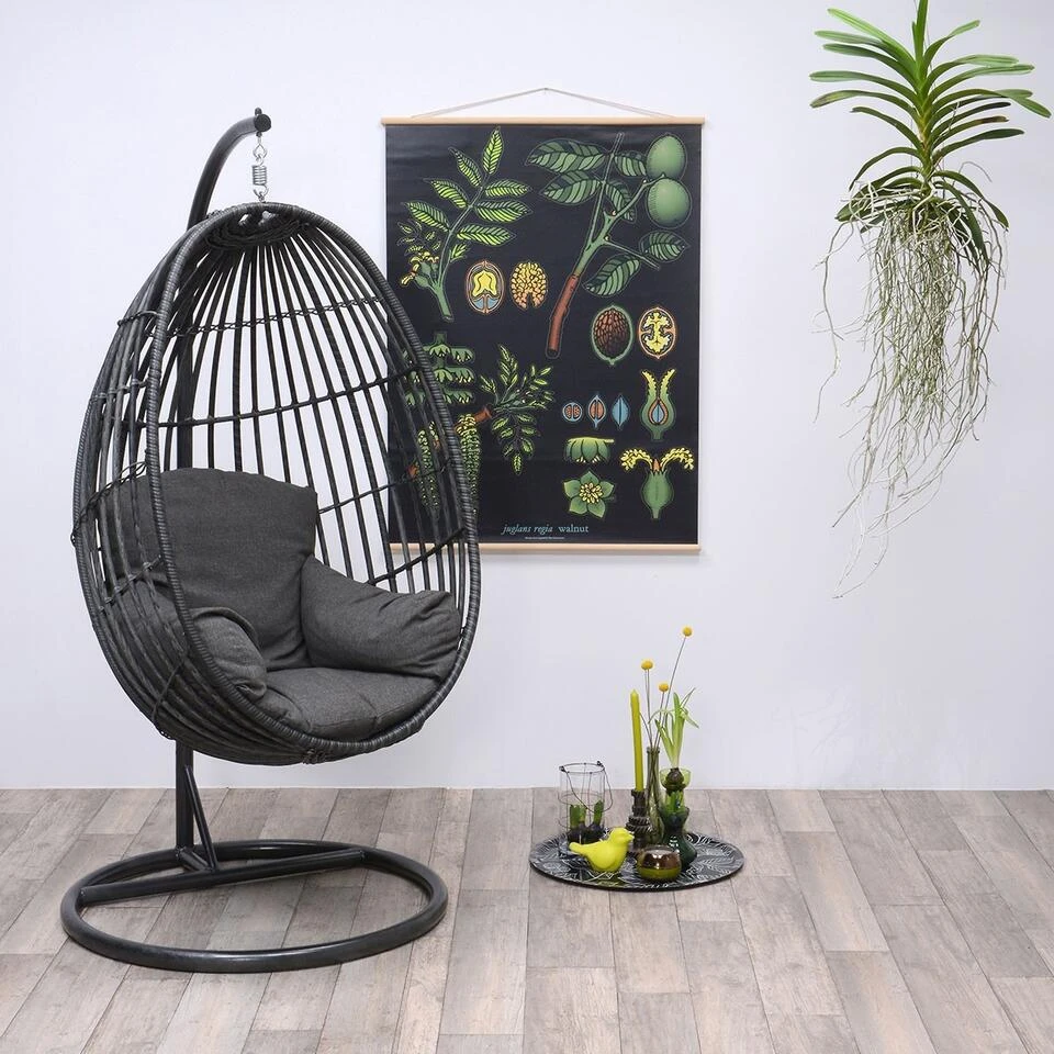 Het ei is gemaakt van aluminium met weerbestendig wicker. Het ei wordt bevestigd aan het meegeleverde stevig stalen frame voor voldoende stabiliteit. Kies ook voor design in je tuin en relax heerlijk in deze opvallende hangstoel. Ook geschikt voor binnenshuis als opvallende blikvanger!