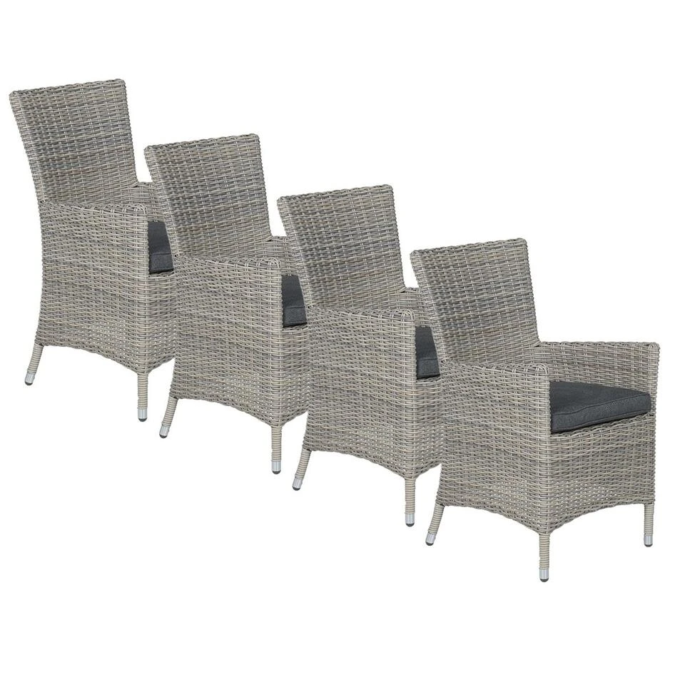 Zoek je vier prettige tuinstoelen gemaakt van wicker vlechtwerk draad, maar wil je hier simpelweg niet de hoofdprijs voor betalen? Dan is de set van 4 Sharon tuinstoelen van kwaliteitsmerk Garden Impressions een goede keuze. Deze tuinstoel heeft een comfortabele zit en wordt bovendien geleverd inclusief zitkussen.