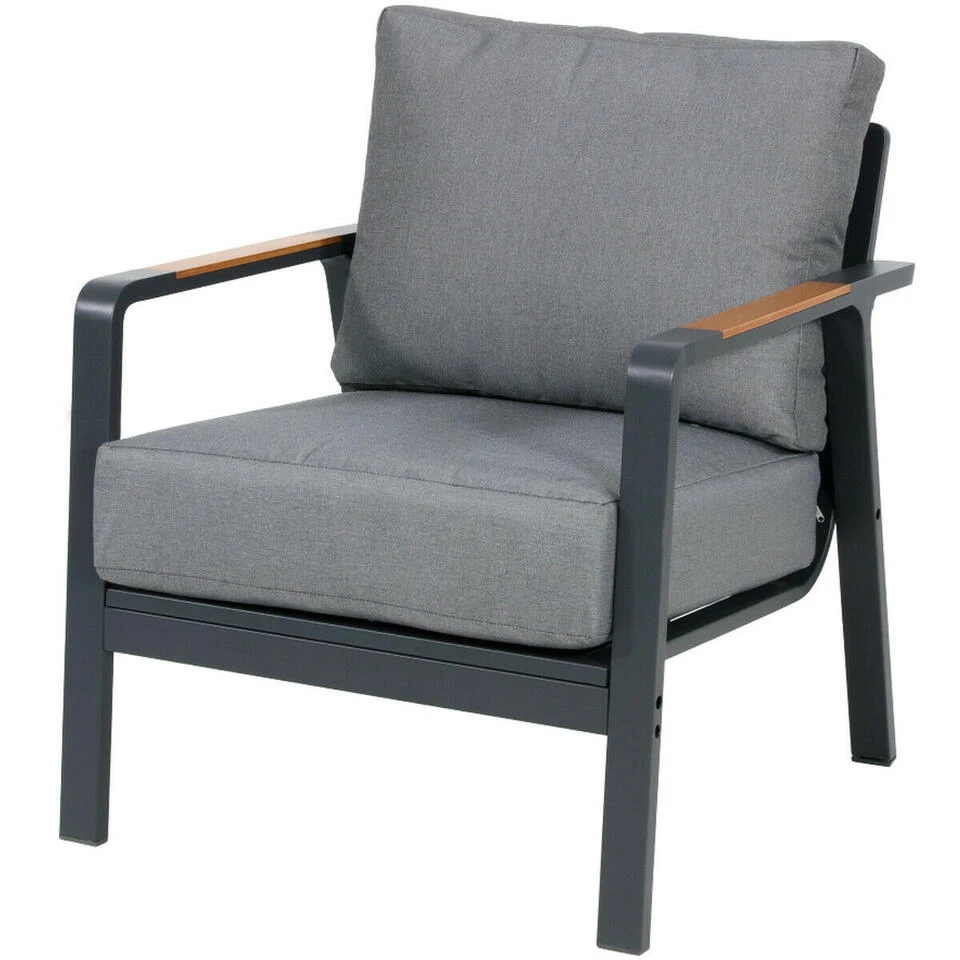 Geniet van de perfecte combinatie tussen stijl en comfort met loungestoel Mai Tai! Deze prachtige stoel komt uit de collectie van het merk Les en heeft een afmeting van B69xD79xH78 cm. Hij is uitgerust met een stevig en onderhoudsarm aluminium frame met een matte donkergrijze kleur als afwerking. Opvallend aan dit frame zijn de armleuningen, welke voorzien zijn van een decoratieve teaklook. Dankzij het fijne dikke en zachte zit- en rugkussen (245gr/m² olefin) kan er heerlijk lang op deze stoel gezeten worden. Combineer loungestoel Mai Tai ook met de andere outdoor meubelen uit de Mai Tai serie en geniet van een stijlvol geheel.