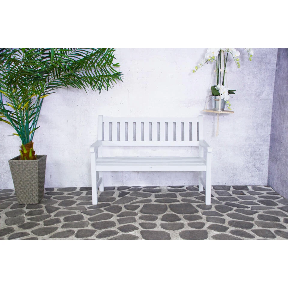De moderne tuinbank is gemaakt van grenenhout en gebeitst in een witte kleur. Het 100% FSC gecertificeerde hout heeft een lange levensduur. Dit bankje biedt 2 zitplaatsen voor in je (kleine) tuin, balkon of voortuin.