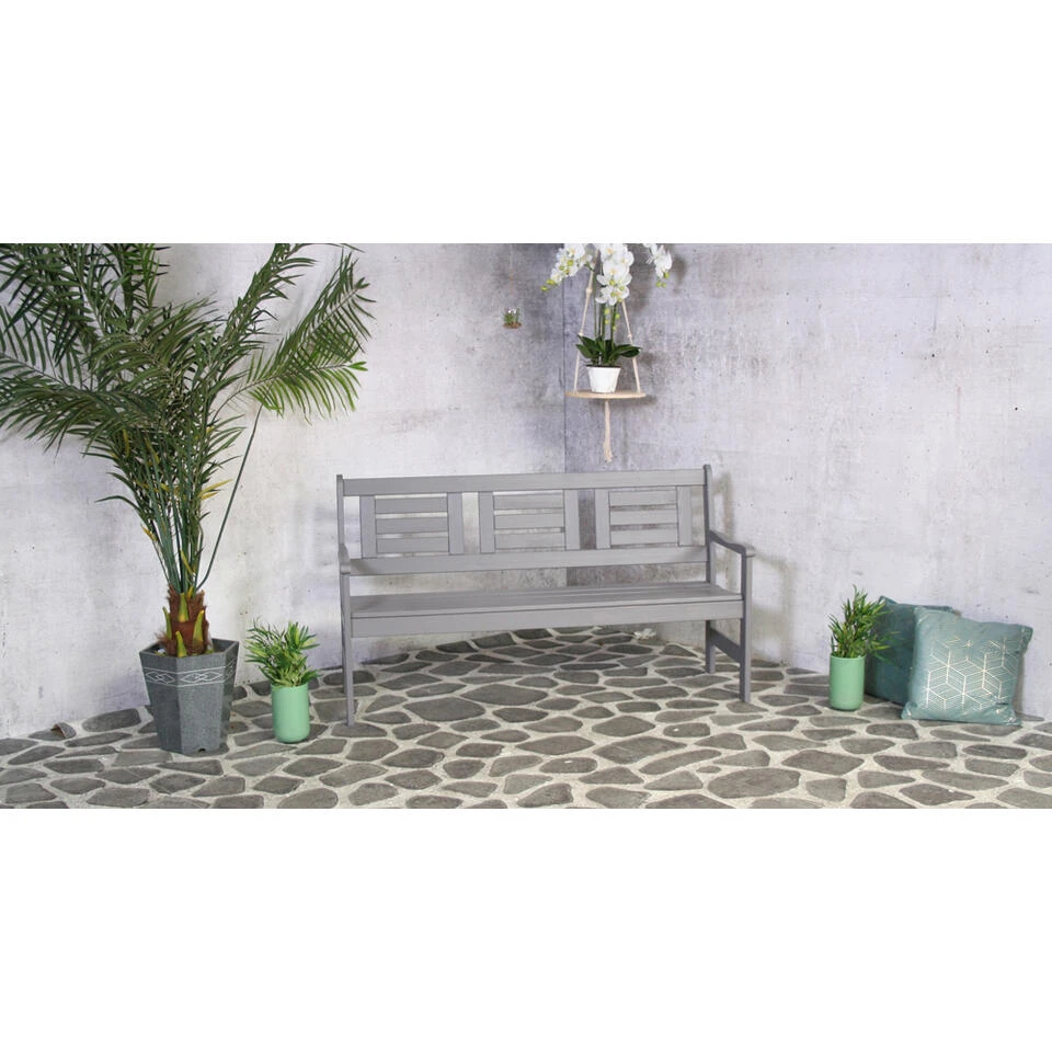 De compacte bank biedt 3 zitplaatsen voor in je (kleine) tuin, balkon of voortuin. De strak vormgegeven tuinbank is gemaakt van grenenhout en is gebeitst in een grijze kleur. Het 100% FSC gecertificeerde hout heeft een lange levensduur.