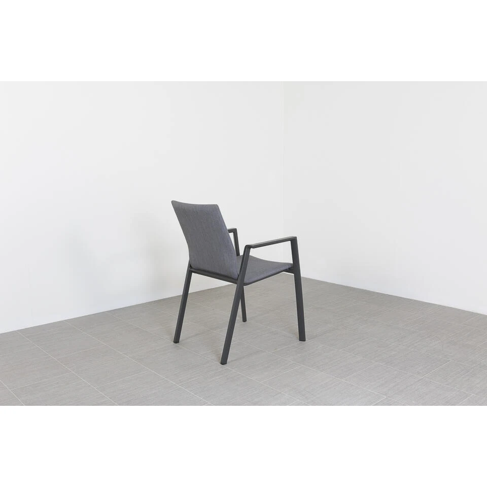 De Stapelbare tuinstoel Lima is een strakke tuinstoel met een morderne vormgeving uit de ruime collectie tuinstoelen. De stoel is gemaakt van aluminium frame met antraciet coating. De zit en rugleuning zijn gemaakt van textileen. Dit textileen is grijs van kleur en combineert erg goed bij het antraciet frame. De stoel is erg goed te combineren bij verschillende tuintafels.