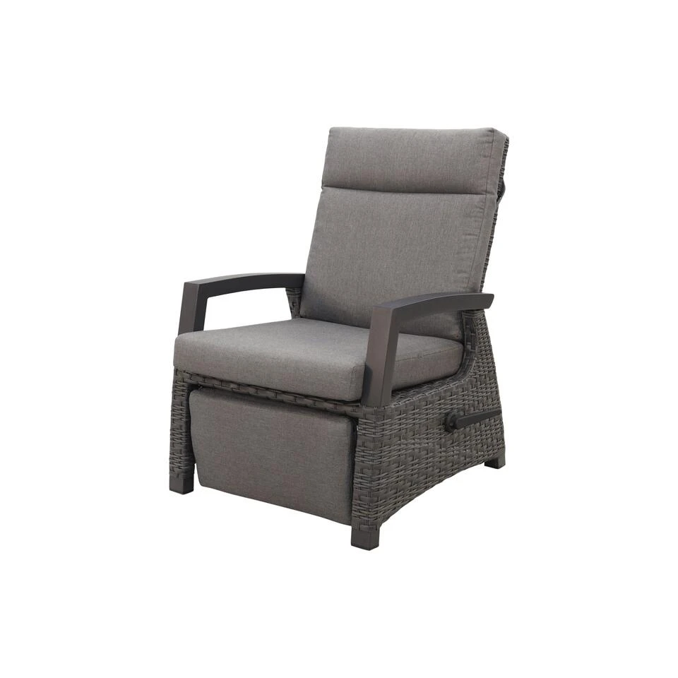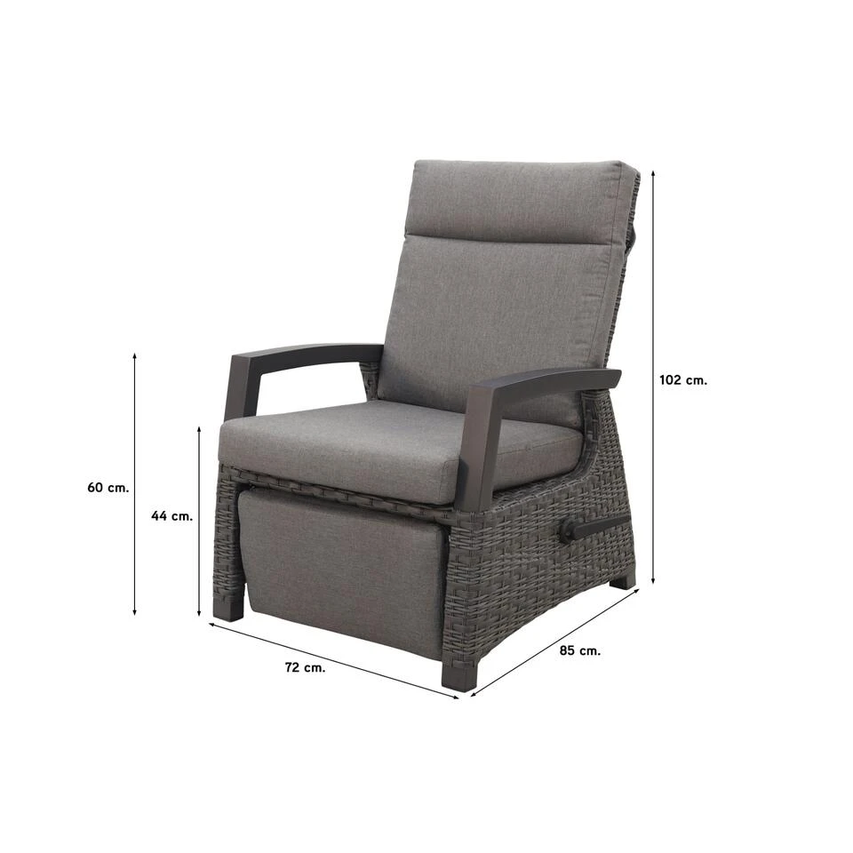 De Loungestoel heeft een aluminium gepoedercoated frame. Aluminium heeft als voordeel het gewicht, de stevigheid en het materiaal kan niet gaan roesten. Om dit frame is het wicker gevlochten. Het wicker is uitgevoerd in de kleur antraciet. Dit combineert mooi bij het antraciet frame van de wicker verstelbare loungestoel. Het zit en rugkussen is uitgevoerd in een grijze kleur. Het zitkussen is voorzien van een ritssluiting zodat het, als vuil is geworden, uitgewassen kan worden. Aan de bovenkant van het rugkussens zijn “hengsels” gemaakt die het kussen mooi op zijn plaats houden.Â